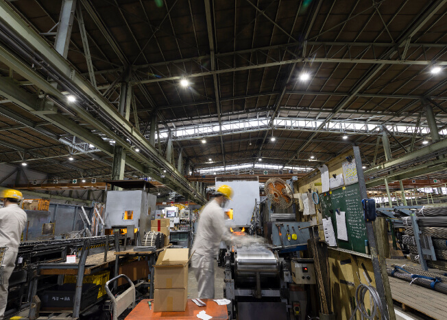 パイプの製造だけでなく、帯鋼の冷間圧延、熱処理、スリット(裁断)など材料加工作業までを社内で行う川上戦略で、コストダウンに貢献しています。